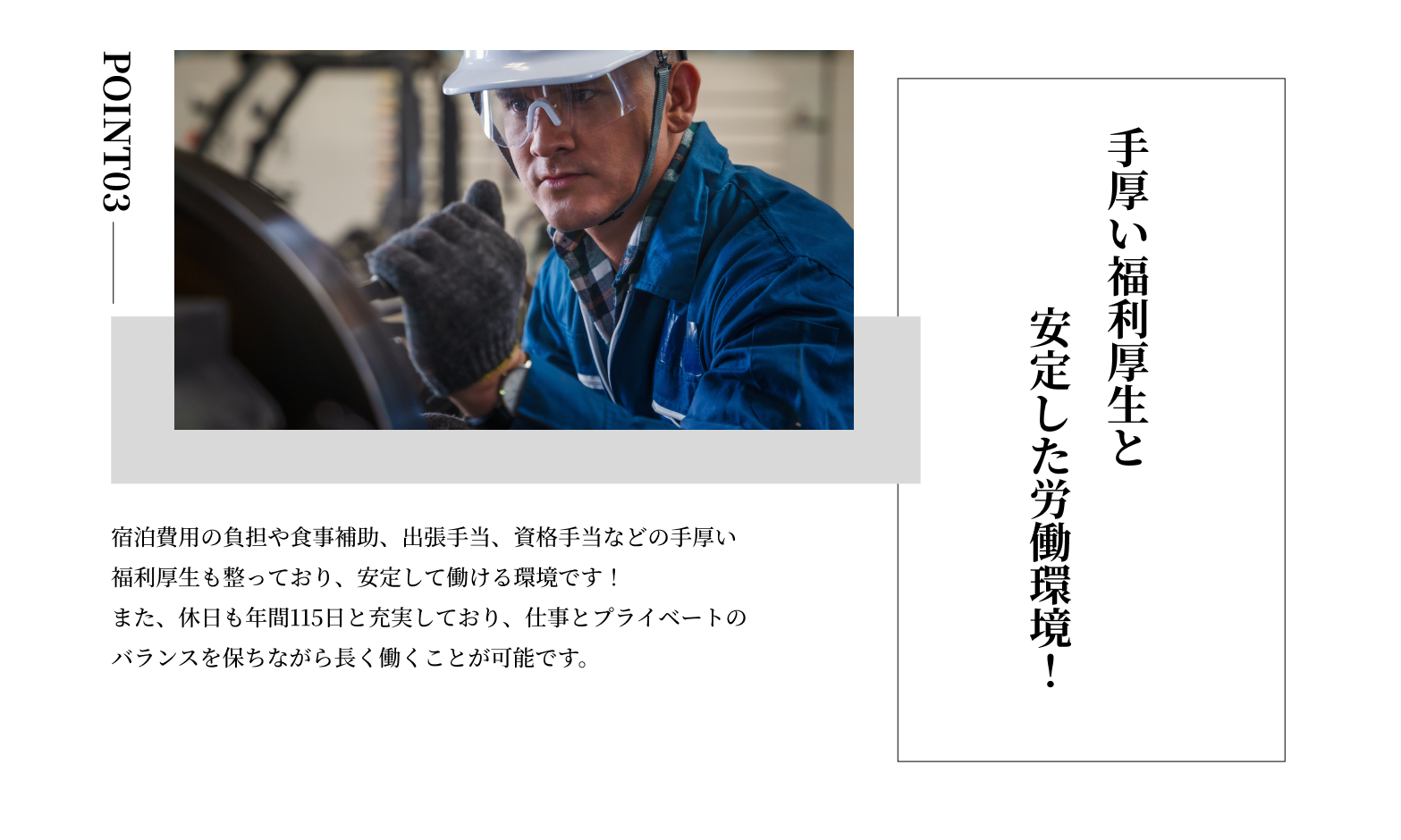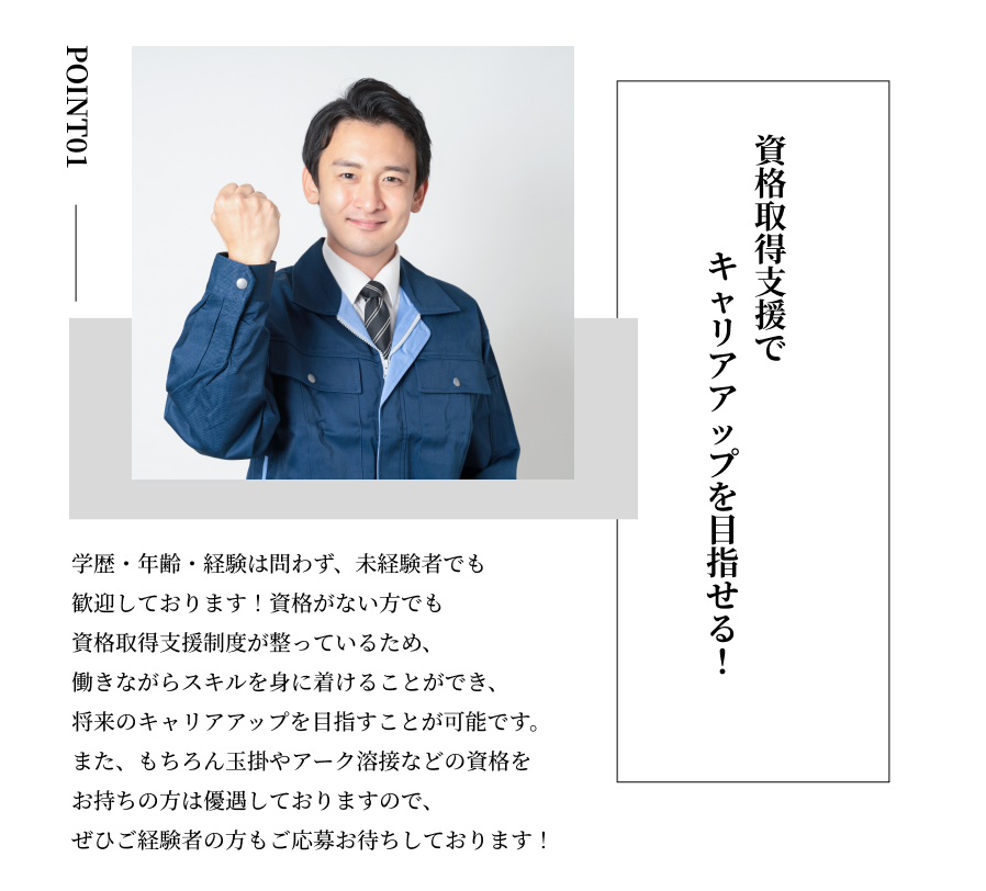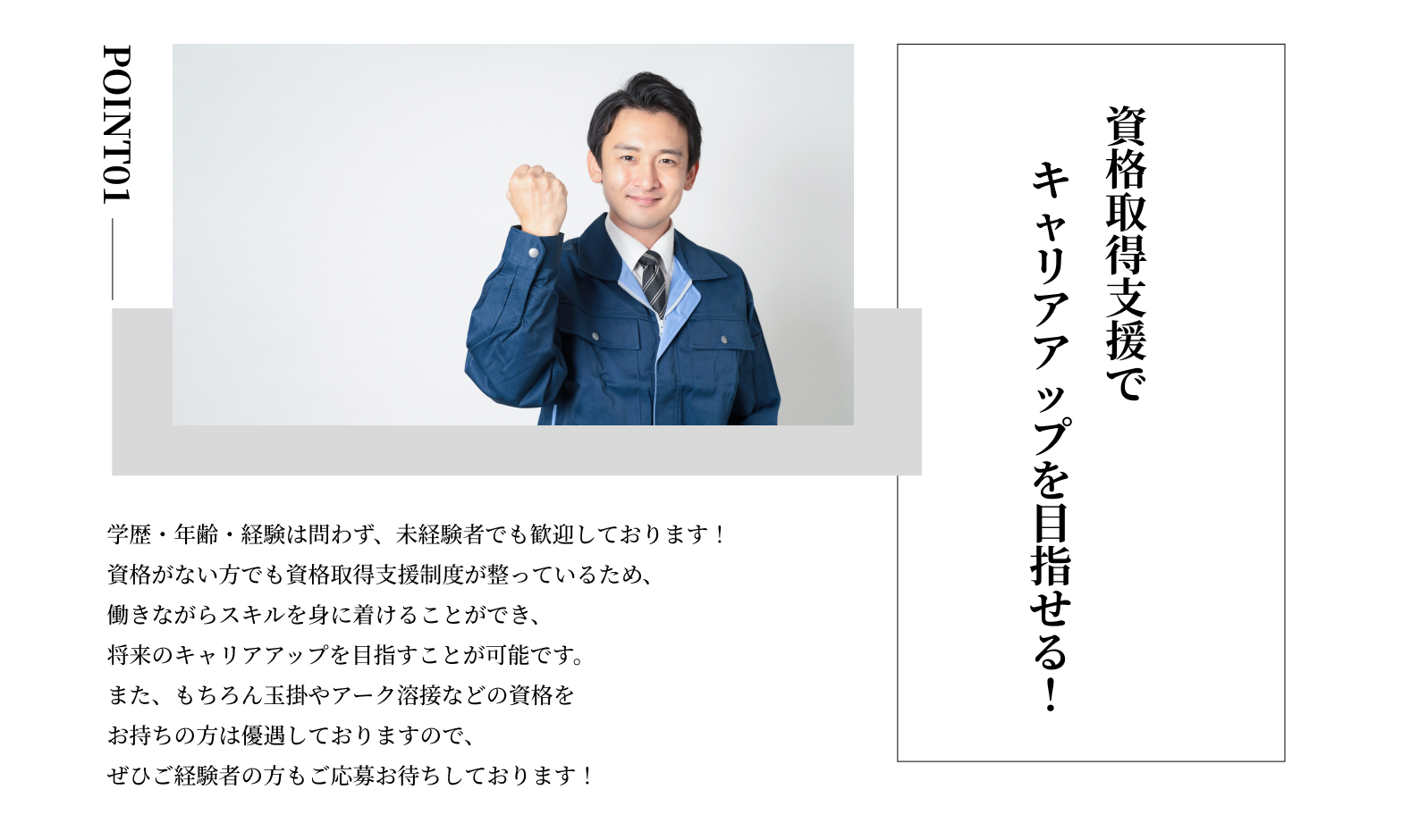 | 資格等 | 学歴・経験は不問です。 玉掛技能者・アーク溶接技能者・ガス溶接技能者・移動式クレーン運転士免許保持者、経験者優遇。 |