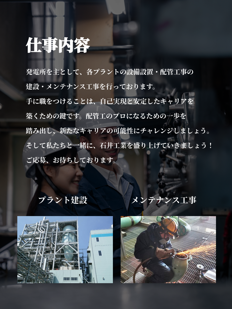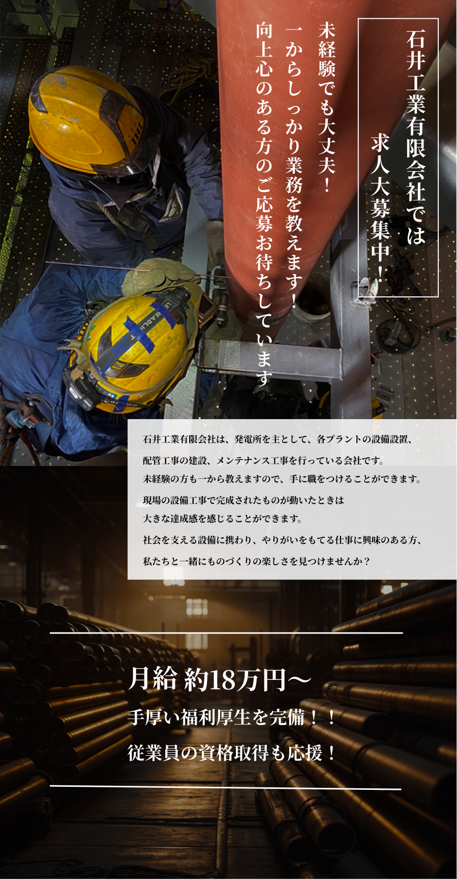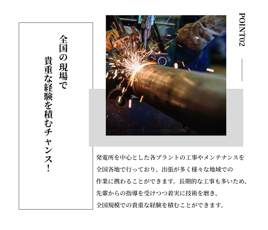 | 仕事内容 | 発電所を主として、各プラントの設備設置配管工事の建設メンテナンス工事 |