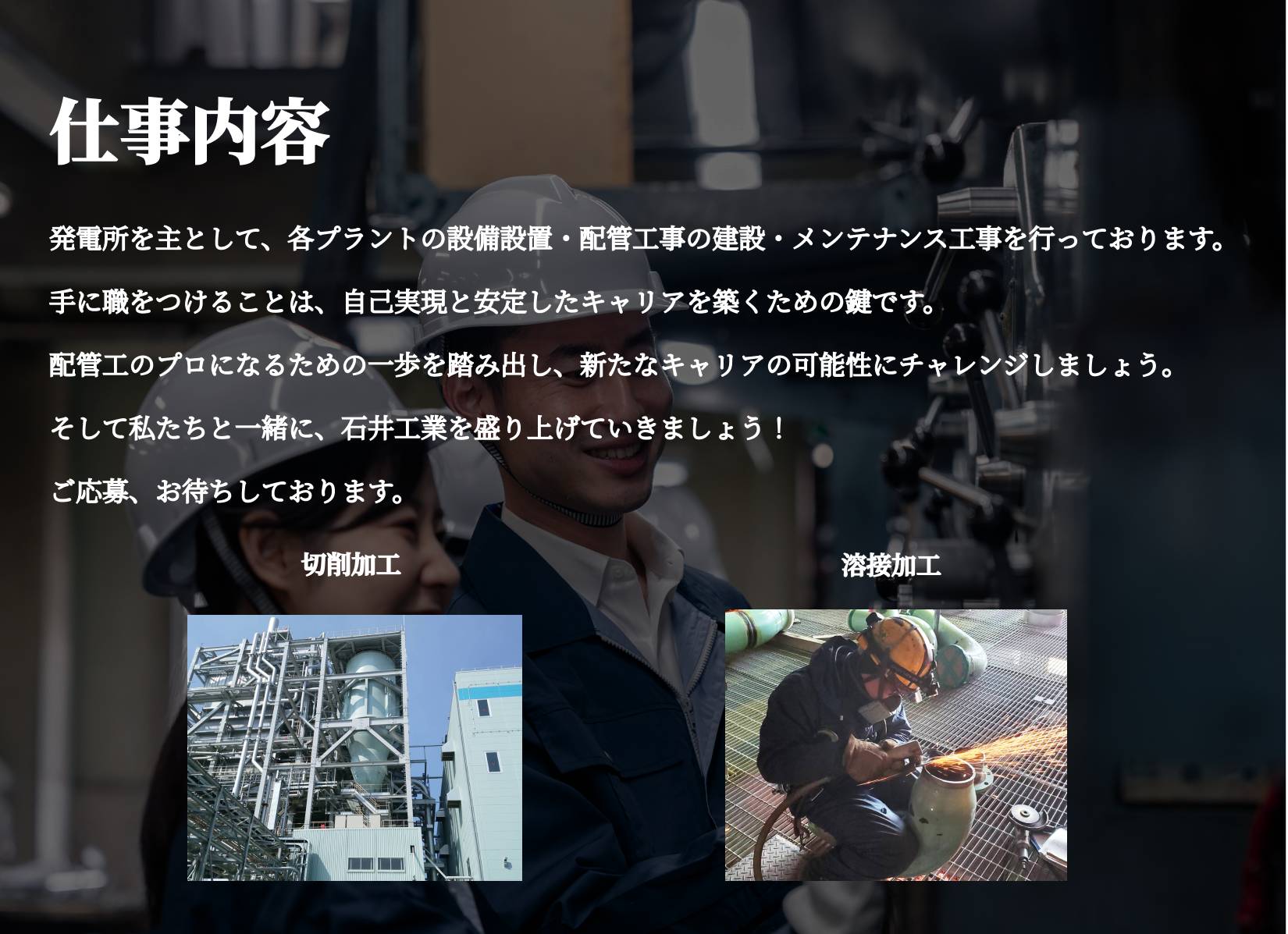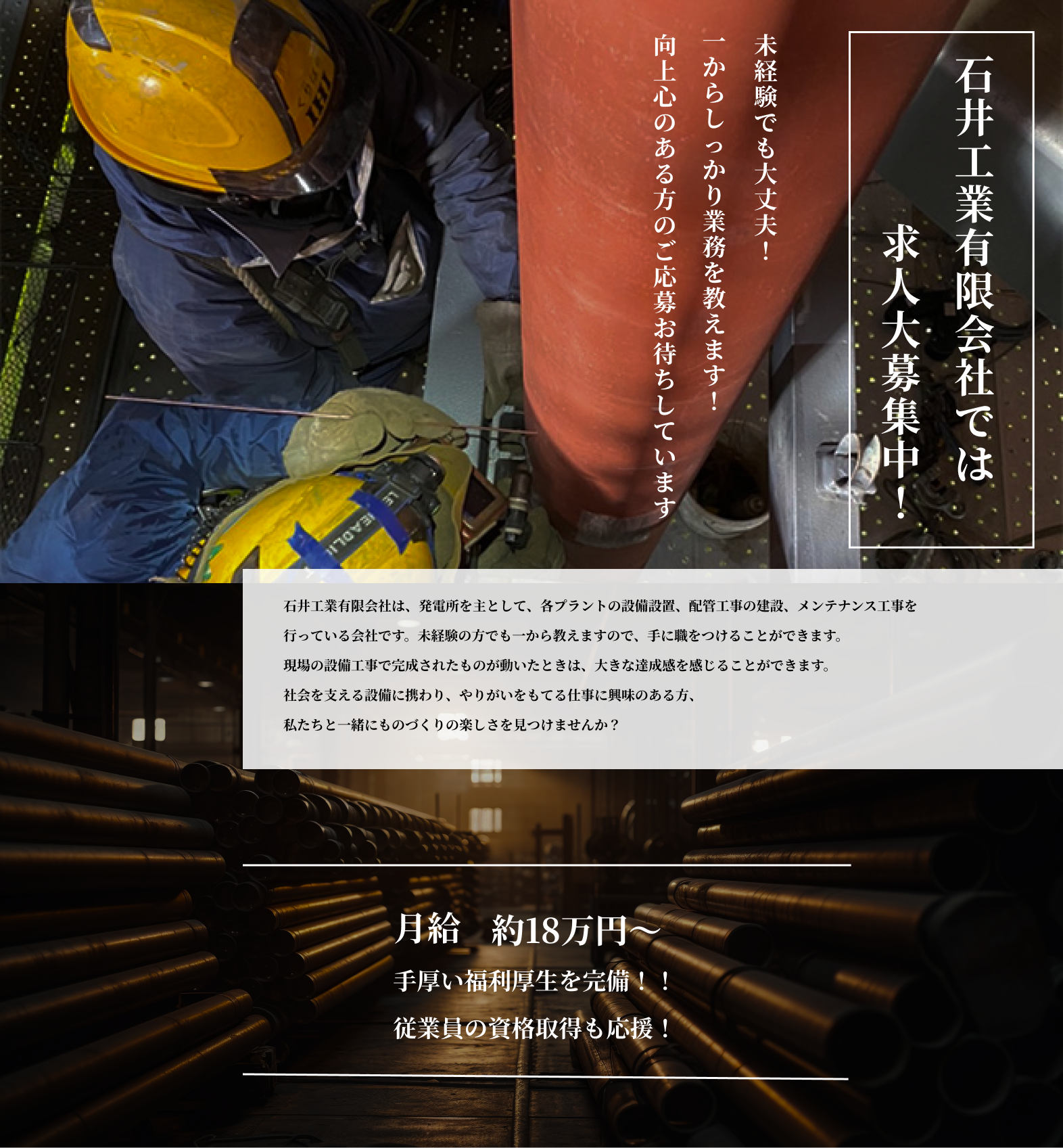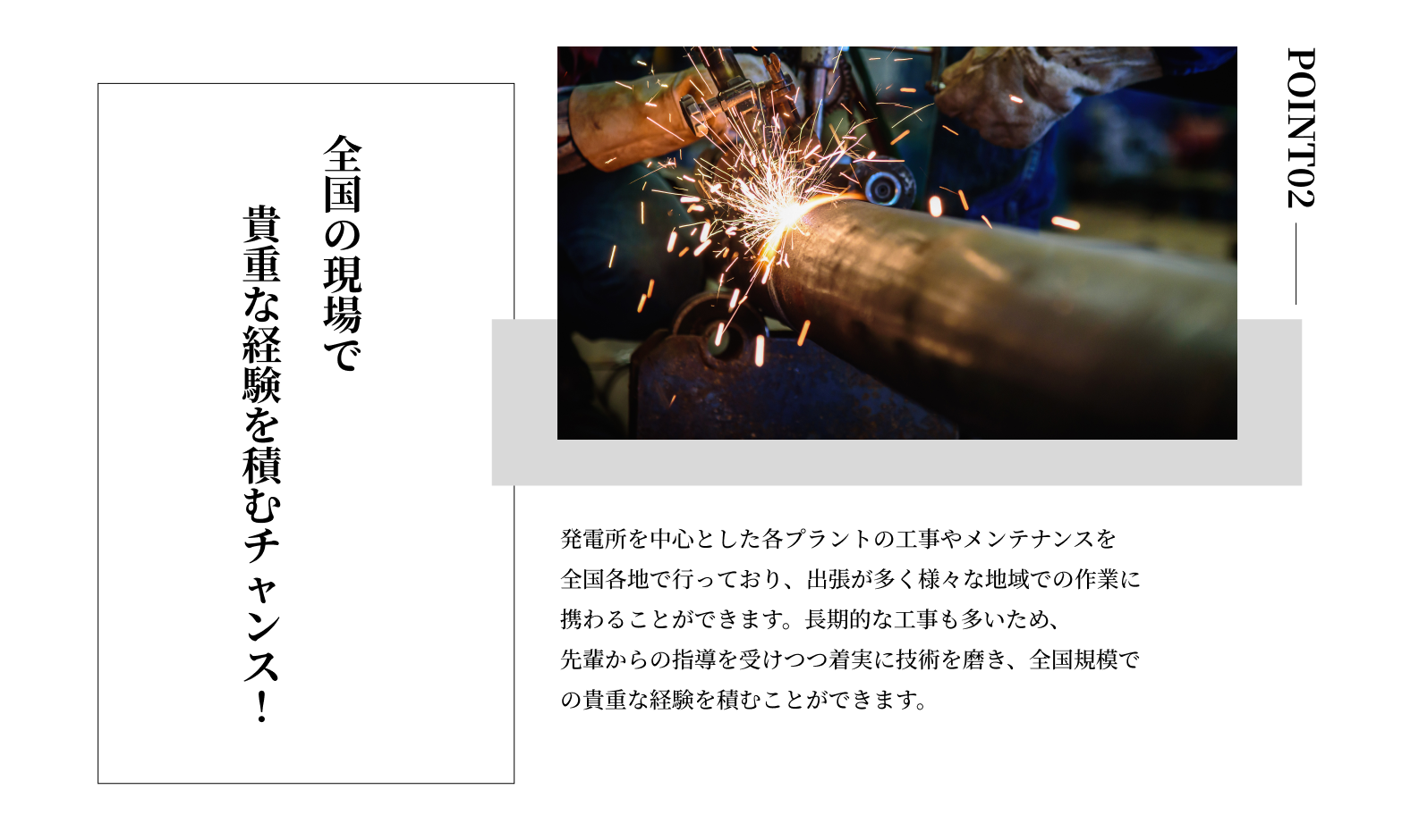 | 仕事内容 | 発電所を主として、各プラントの設備設置配管工事の建設メンテナンス工事 |